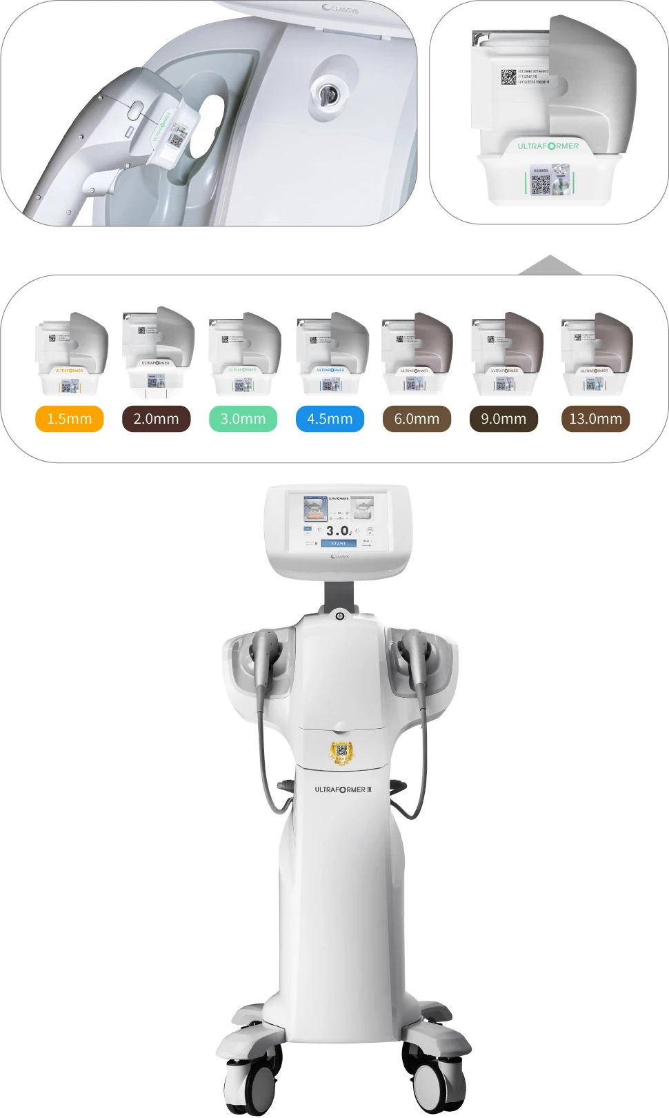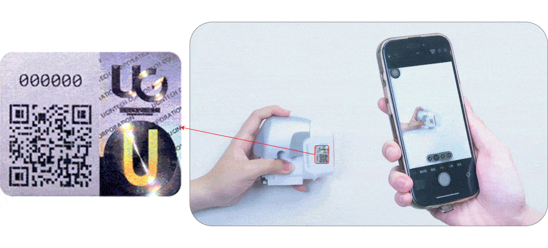 治療探頭貼有雷射防偽標籤,「U」「G」會隨觀看角度產生變形縮放的效果;使用手機掃描QR code至海芙認證雲端頁面驗證探頭真偽。