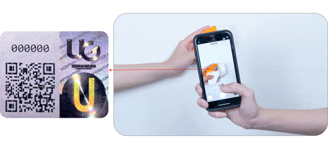 治療探頭貼有雷射防偽標籤,「U」「G」會隨觀看角度產生變形縮放的效果;使用手機掃描QR code至海芙認證雲端頁面驗證探頭真偽。